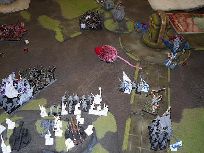 The Engine deals a wound to the Bloodcrushers in the magic phase, and the Slann conflagurates into the Plague Monks, killing 10 (and it turned out we did this VERY wrong... but it didn't matter in the end result). The Handgunners fire point blank into the Lord of Change, dealing three wounds, resulting in it's death. In combat, the Steam Tank gets 12 impact hits... and does 2 wounds. Stupid 4+ ward save. The Flesh Hounds lose combat by 4 and blow up, the Temple Guard finally get wiped out, but the Slann holds.